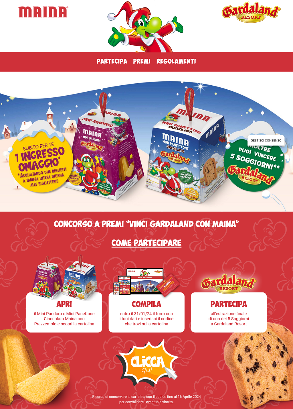 Tutti coloro che nel periodo della promozione acquisteranno nei punti vendita aderenti alla manifestazione i prodotti in promozione riportanti sulla confezione la pubblicità del concorso a premi, potranno partecipare all’estrazione finale di uno dei 5 soggiorni presso GARDALAND RESORT per 4 persone, ognuno comprensivo di: